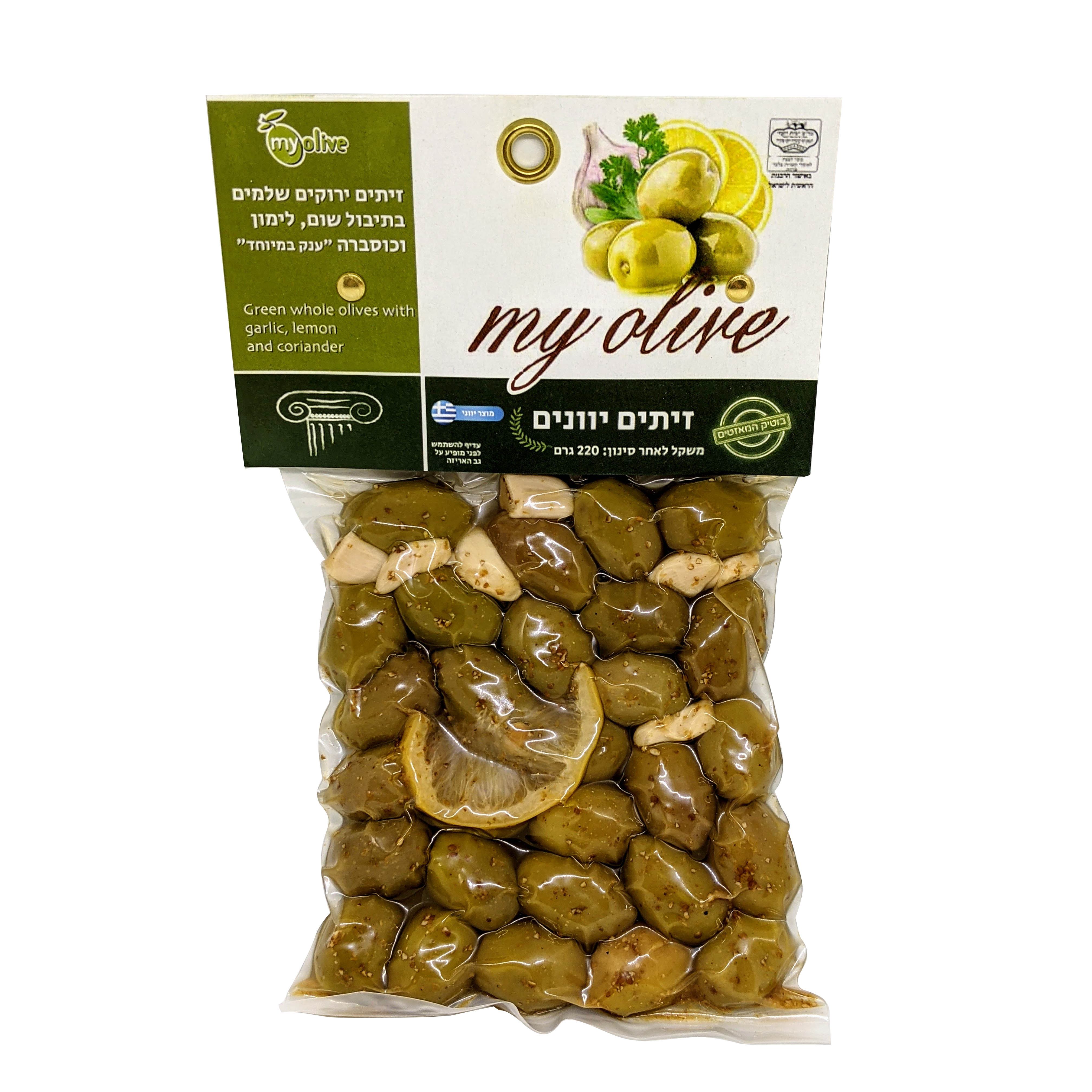ראשי > זיתים > זיתים ירוקים שלמים בתיבול שום לימון וכוסברה