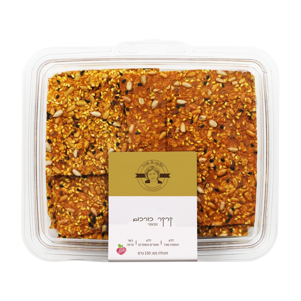קרקרים פריכים בטעם ביתי מועשרים בכורכום,מכיל: קמח שיפון מלא (גלוטן), שיבולת שועל (גלוטן), גרעיני חמניות, שומשום, גרעיני פשתן, שומשום שחור, שמן זית, מלח שולחן, אבקת כורכום, מים