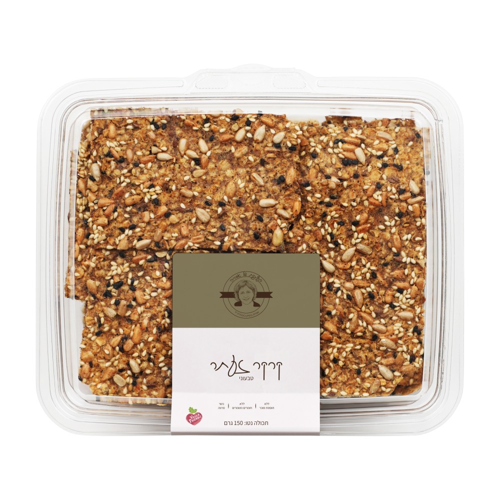 קרקרים פריכים בטעם ביתי, מכיל: קמח שיפון מלא (גלוטן), שיבולת שועל (גלוטן), גרעיני חמניות, שומשום, גרעיני פשתן, שומשום שחור, שמן זית, מלח שולחן, אבקת זעתר, מים