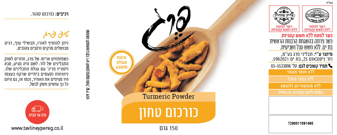 100% כורכום מזן משובח. ניתן להוסיף לאורז, לתבשילי עוף, לדגים מבושלים, למרקים ולרוטבים צהובים